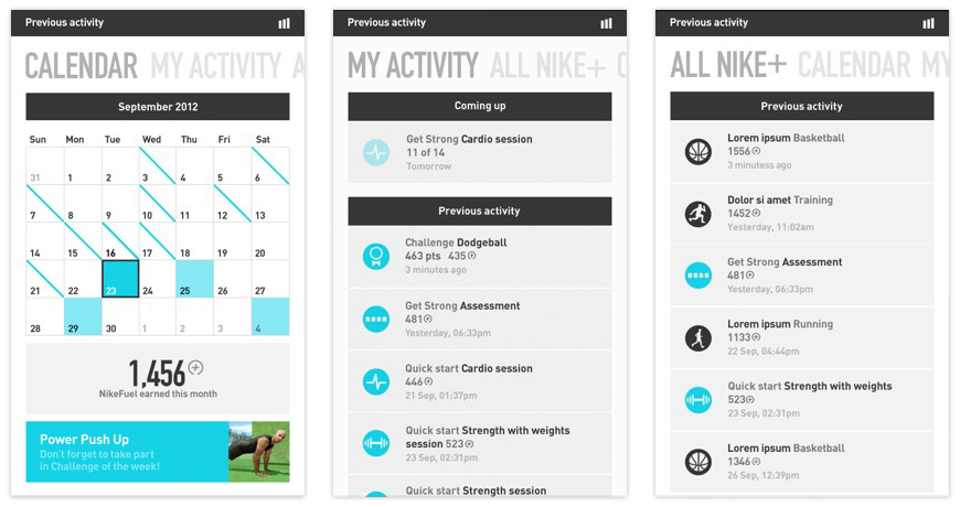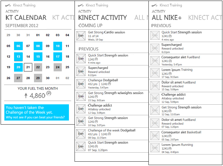 This provides an overview of the user’s activity, beginning with the calendar view. It documents all previous and future kinect activity, allows users to click-through to and navigate multiple activity on any given day, and details all Nike+ activity.