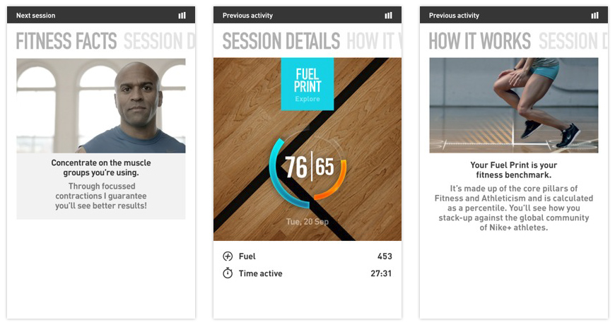 This section allows the user to explore their current and previous 5 fuel print scores. Exploration utilizes the panorama system, with the central state being the user’s fuel print. Swiping left reveals the fitness sub pillars, while swiping right shows the athleticism sub pillars. Below each is a breakdown of the exercises that help build the sub pillar.