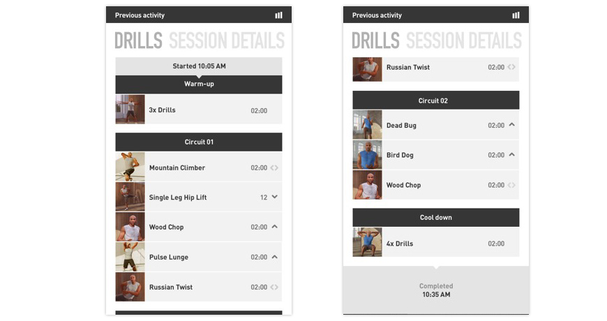 This provides a chronological list of drills that the user has engaged in, during their previous session. This covers warm-ups, circuits, challenges and cooldowns. It also calls-out completed and incomplete sessions.