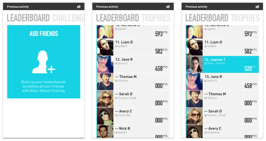 The leaderboard documents the user’s performance during a challenge, while in competition against their community of friends. From here users (who are involved in the challenge) can poke friends who haven’t competed, which further encourages social activity. The leaderboard appears for a maximum of 7 days before refreshing to reveal the leaderboard for the next challenge.