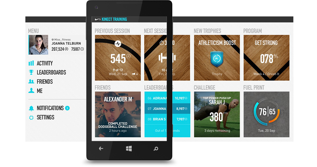 The N+KT App is an experience that will be built for the Mobile phones that allows users to take their experience using Nike + Kinect training beyond the console experience. Users will be able to view their Console activity, get notified when scheduled sessions are coming up, and connect with other XBOX/Nike+ users.